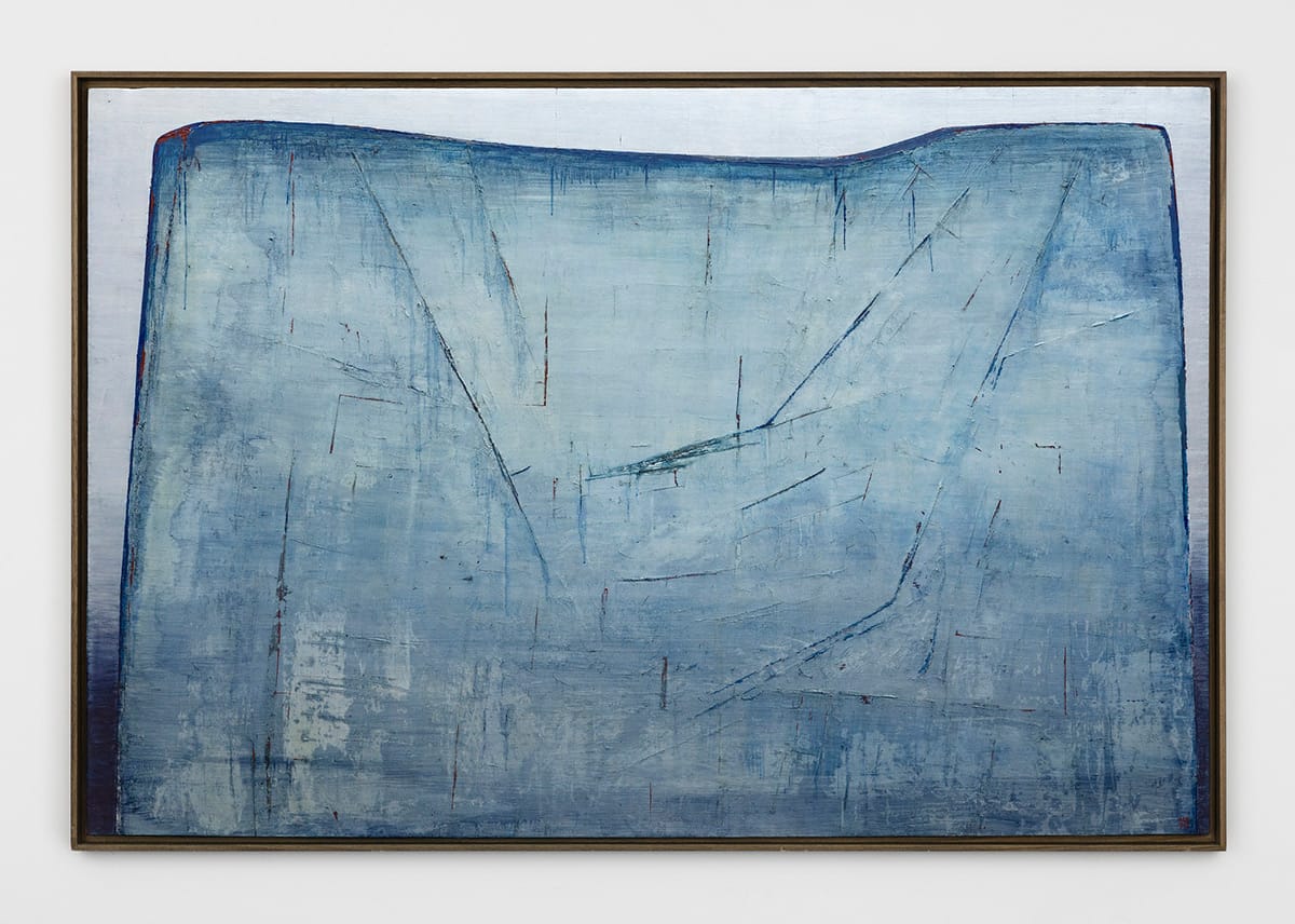 C’est précisément ce défi que la peintre relève ici. La montagne s’impose comme une grande forme monumentale mais évanescente. L’usage de la feuille de métal, matériau signature de son œuvre, crée une surface vibrante dont les reflets changent selon la lumière. Bergman travailla à même le métal – grattant, polissant, incisant – créant ainsi des stries et aspérités, tandis que les traces de pinceau, glacis et coulures bleues évoquent un relief à la fois stable et flottant, comme si les contours du monde se dissolvaient dans une immensité glacée.