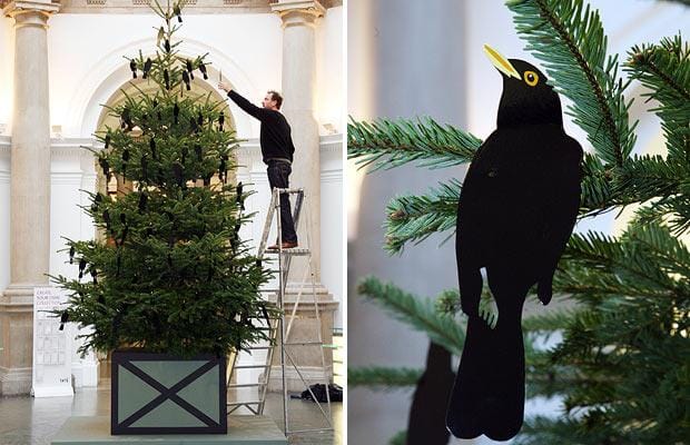 L’artiste sélectionna un traditionnel sapin Nordmann avec, en guise d’ornements, une nuée de merles découpés dans une feuille d’acier, au pochoir, dans un geste à la fois simple et précis rappelant ses recherches picturales sur la réduction formelle. Gary Hume peignit ensuite chaque oiseau dans un noir profond avant de les placer sur les branches, comme autant de décorations détournées.