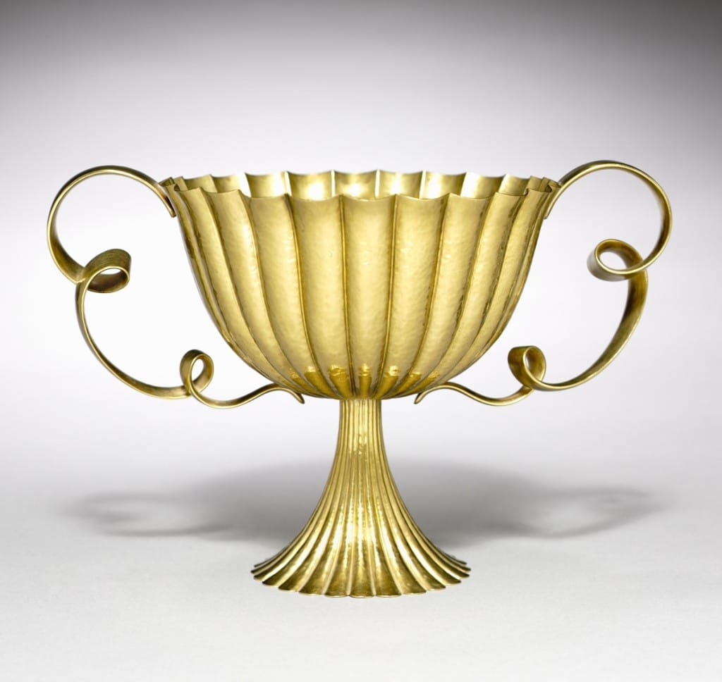 Chez Hoffmann, toutefois, l’ornement n’est jamais gratuit : il est rigoureusement intégré à la structure de l’objet. Ces anses, façonnées à la main, contrastent avec la géométrie claire de la coupe et du pied, qui joue subtilement sur l’alternance du concave et du convexe. La surface martelée, caractéristique du travail du métal au début du XXᵉ siècle, capte la lumière de façon vibrante, animant l’objet sans recourir à un décor appliqué, et maintenant un lien avec le savoir-faire manuel, cher à l’artiste.